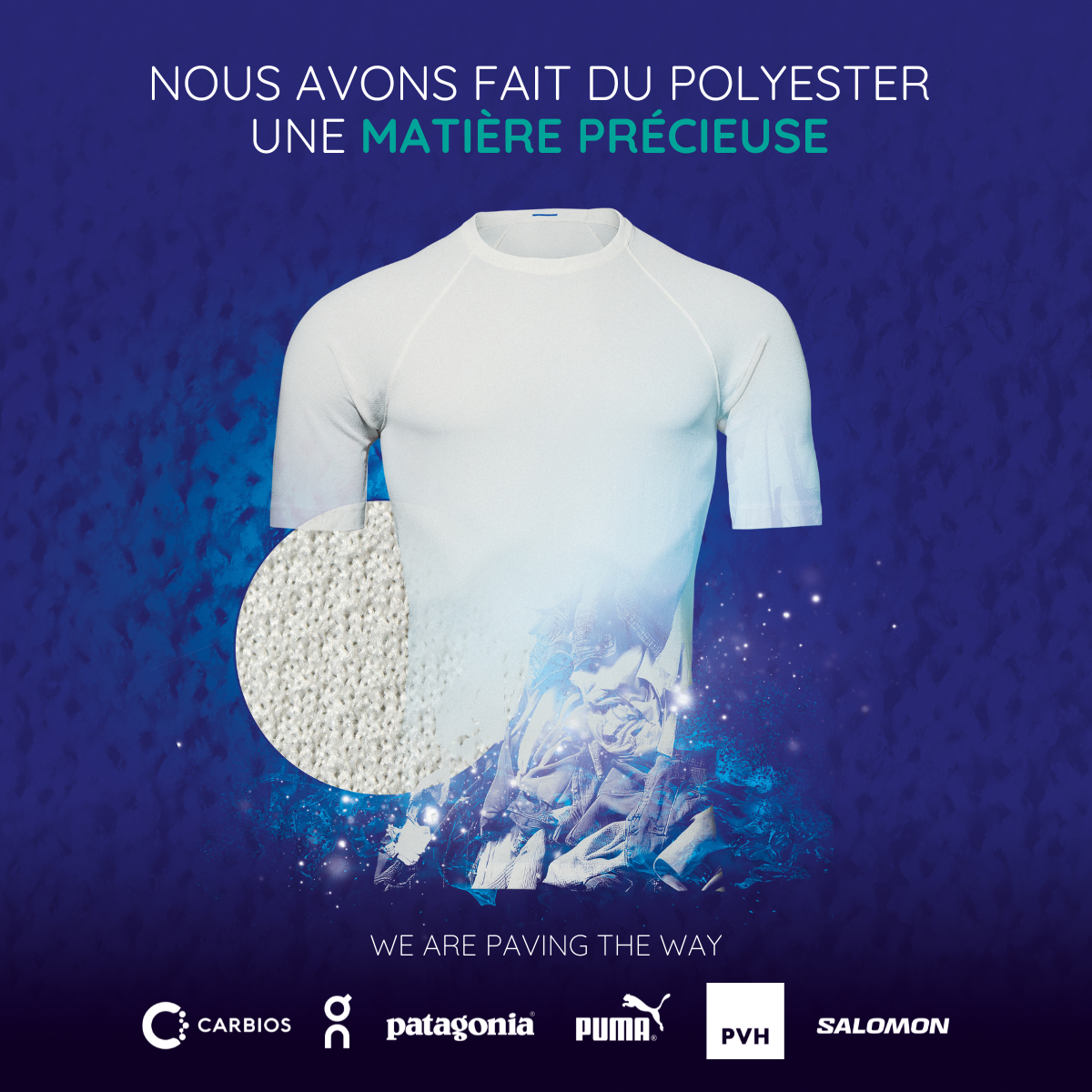 Le choix d’un simple t-shirt blanc a été délibérément pris pour faire la démonstration de l’avancée technologique qui a permis sa production à partir de déchets textiles mélangés et colorés. Grâce à la technologie de biorecyclage enzymatique de CARBIOS, le polyester est déconstruit en ses éléments constitutifs, qui sont ensuite réassemblés afin de produire un polyester biorecyclé dont la qualité est identique à celle du polyester vierge à base de pétrole. Il est maintenant possible de remplacer le pétrole par des déchets textiles afin de produire du polyester qui redeviendra à son tour de la matière première, alimentant ainsi une économie circulaire, avec en prime l’avantage d’une empreinte carbone diminuée et le non-recours à l’enfouissement ou à l’incinération des déchets.