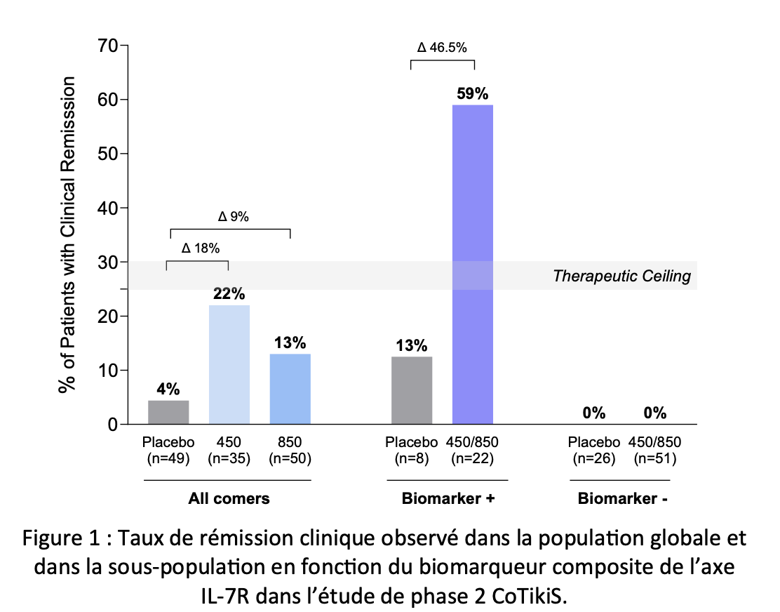 Figure 1 : Taux de rémission clinique observé dans la population globale et dans la sous-population en fonction du biomarqueur composite de l’axe IL-7R dans l’étude de phase 2 CoTikiS.